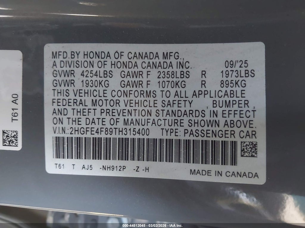 Honda CIVIC HYBRID 2026. Лот с площадки IAAI, рынок 🇺🇸 США, 2026 года, Other, 2.0 л, Автомат, Передний, 8,624 миль.